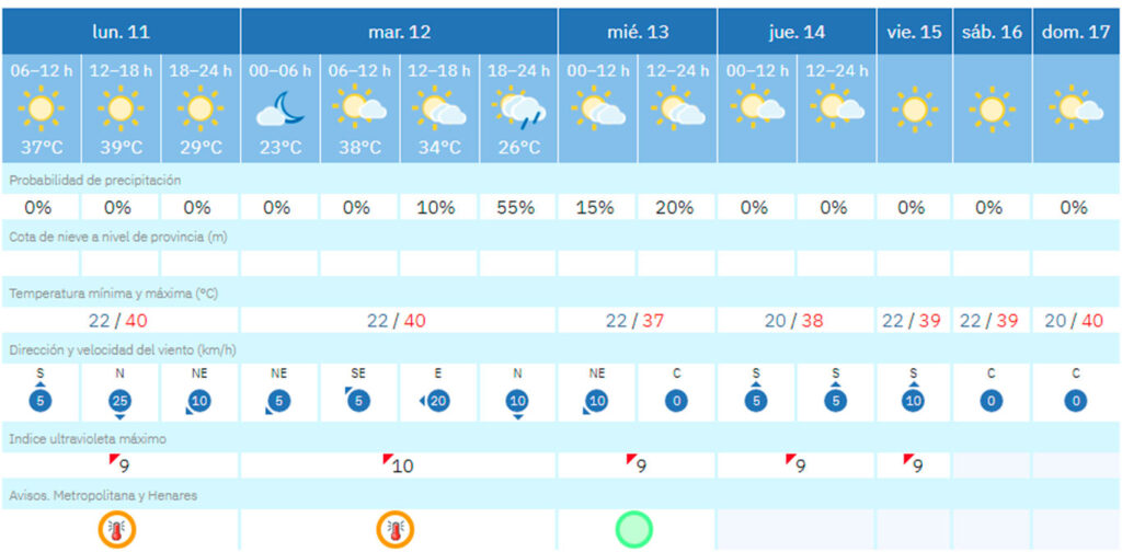 La Agencia Estatal de Meteorología (AEMET) informa del mantenimiento del nivel de aviso naranja del Protocolo de actuación ante olas de calor debido a las altas temperaturas previstas para los próximos días, según el protocolo de actuación de la Comunidad de Madrid ante fenómenos meteorológicos adversos.