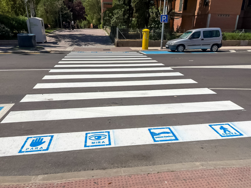 Los pictogramas que se están incorporando en la señalización responden a una secuencia especialmente recomendada para personas con TEA, que consiste en los mensajes: para, mira, coche parado y cruza. Esta señalización visual facilita la comprensión de las normas de seguridad y contribuye a que los niños y niñas interioricen de forma sencilla los pasos necesarios para cruzar la calle de manera segura.