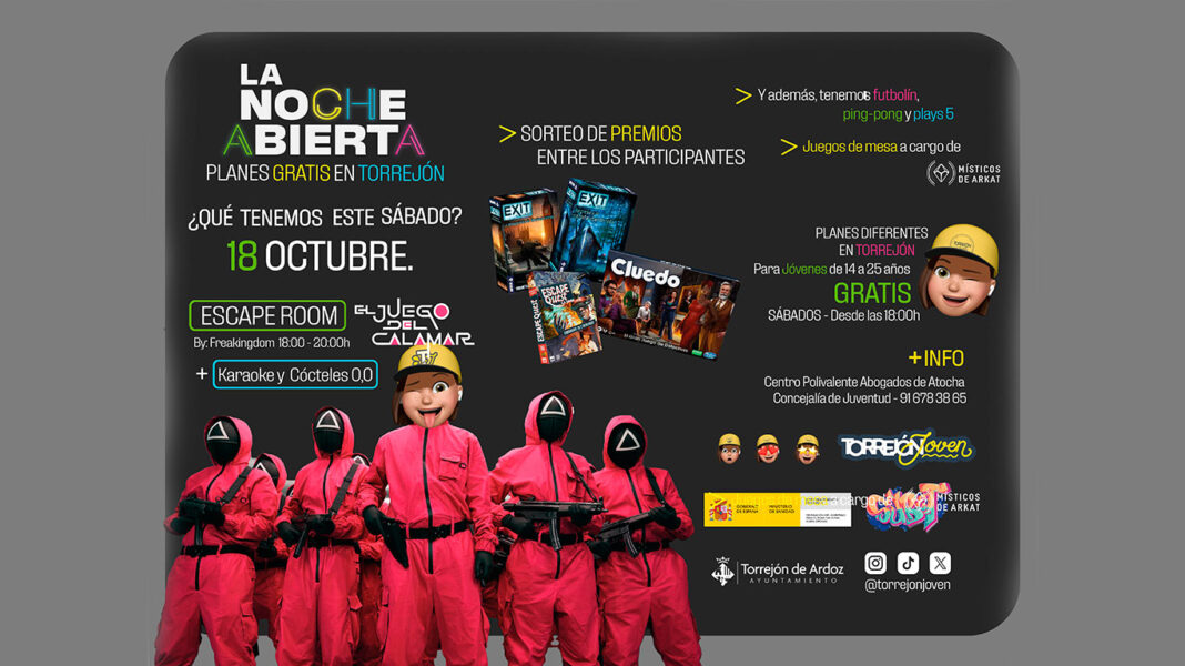 La adrenalina está garantizada. La Noche Abierta del sábado, 18 de octubre, llega con una propuesta única para disfrutar sin límites. Un Escape Room inspirado en El Juego del Calamar, diseñado por los expertos del misterio By Freakingdom, de 18:00 a 20:00 horas.