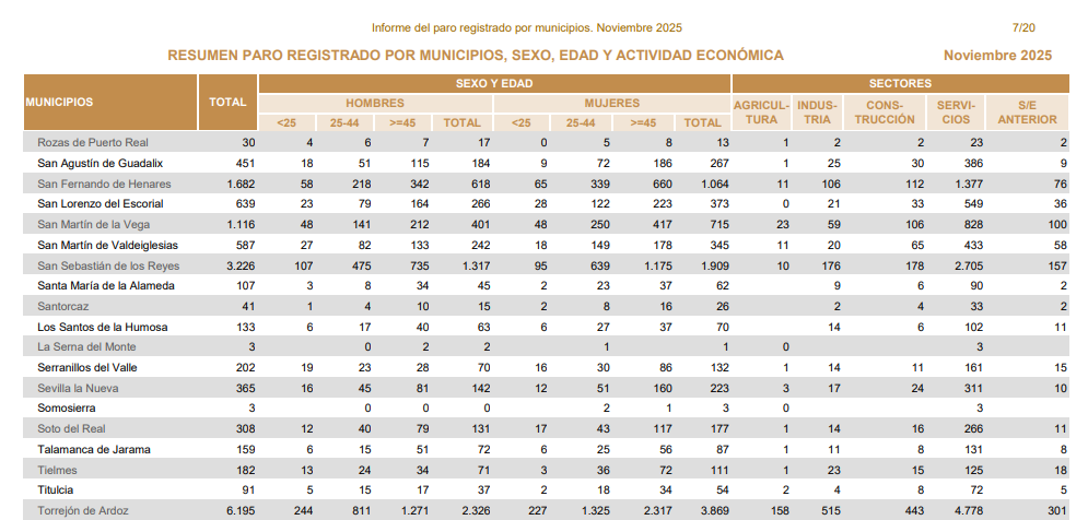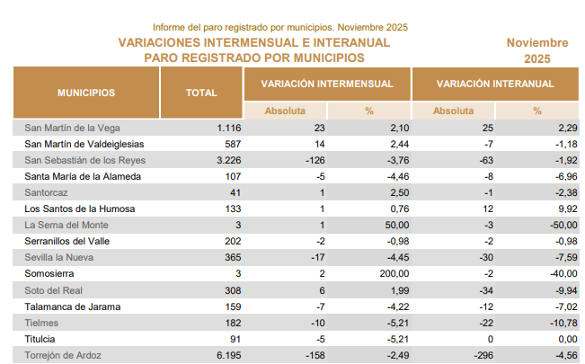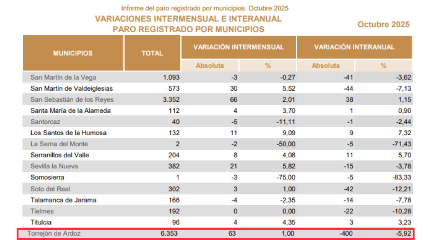 El número de personas desempleadas registradas en Torrejón de Ardoz se situó en 6.195 en noviembre de 2025. Así lo reflejan los datos publicados por la Consejería de Economía, Hacienda y Empleo de la Comunidad de Madrid.