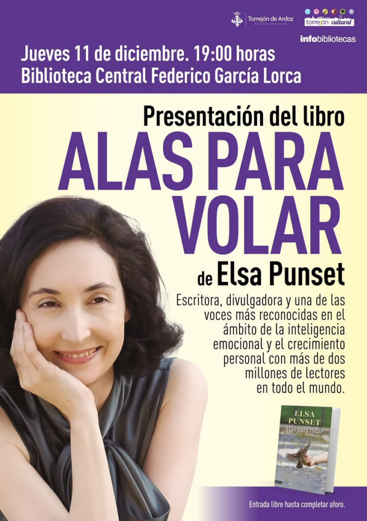 El próximo jueves 11 de diciembre a las 19:00 horas, la Biblioteca Central Federico García Lorca será el escenario de la presentación de Alas para volar, la más reciente obra de Elsa Punset, escritora, divulgadora y una de las voces más influyentes en el ámbito de la inteligencia emocional y el crecimiento personal.