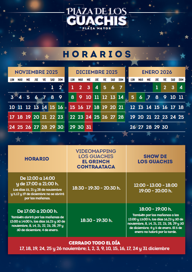 La Plaza de los Guachis abrirá sus puertas desde el 15 de noviembre de 2025 hasta el 5 de enero de 2026, con horarios de 12:00 a 14:00 horas y de 17:00 a 21:00 horas No obstante, los días 15, 21 y 28 de noviembre, así como 5, 12 y 19 de diciembre, permanecerá cerrada por las mañanas.