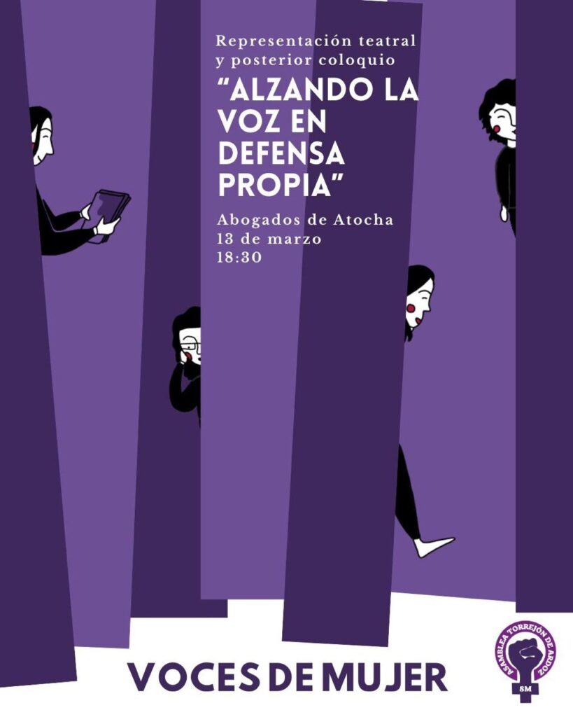 La Asamblea Feminista 8M de Torrejón de Ardoz organizará el próximo viernes 13 de marzo a las 18:30 horas la representación teatral “Alzando la voz en defensa propia”, una obra del colectivo Voces de Mujer que se enmarca dentro de las actividades del mes del 8M.