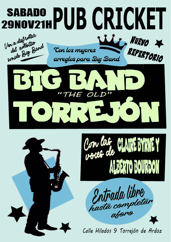 ¡Marca el 29 de noviembre en tu calendario! La Big Band Torrejón vuelve a tomar el escenario del Pub Cricket, situado en la calle Hilados, 9, para ofrecer una noche memorable de música en directo. La cita dará comienzo a las 21:00 horas y contará con entrada libre hasta completar aforo.
