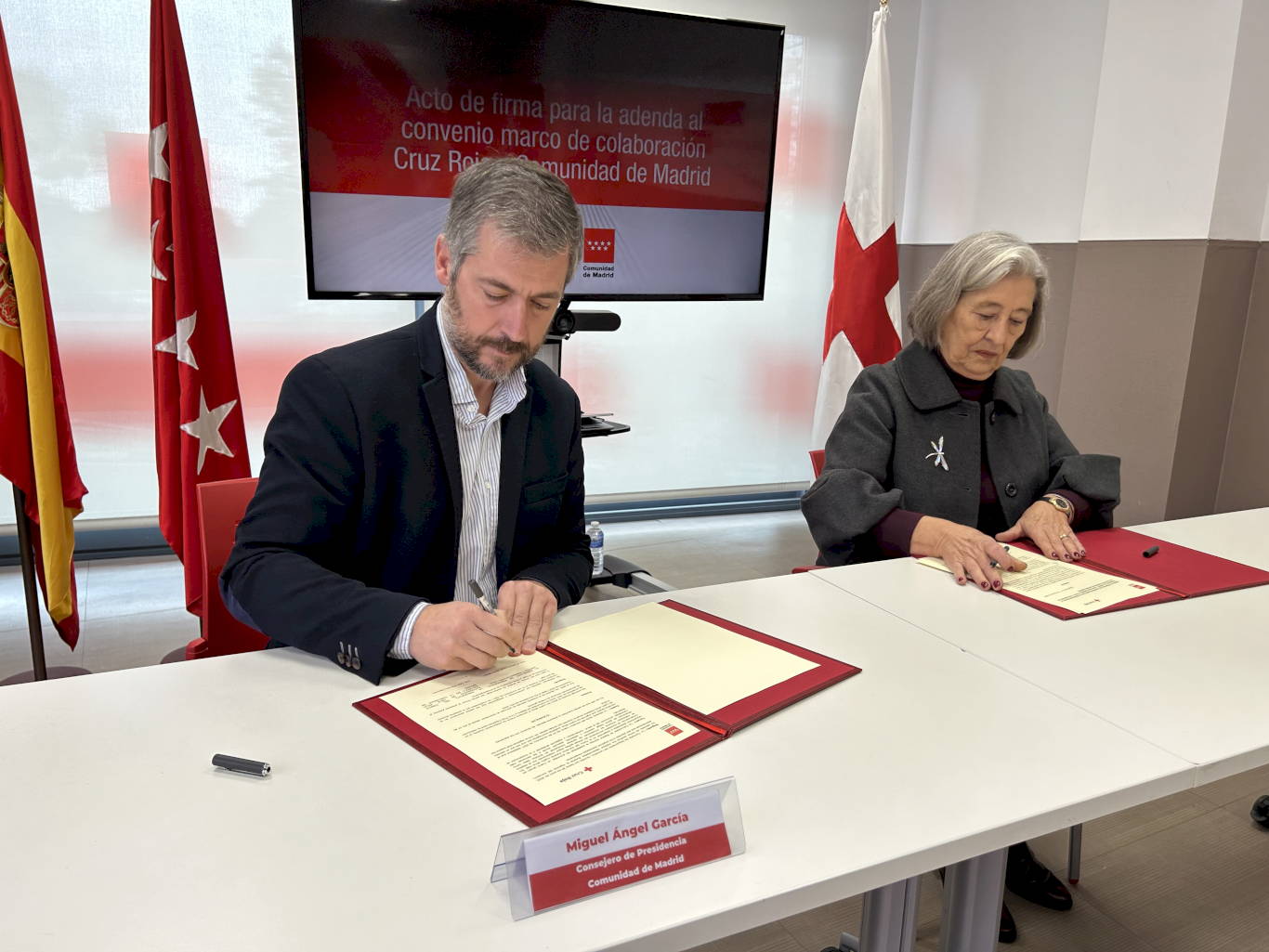 El consejero de Presidencia, Justicia y Administración Local, Miguel Ángel García Martín, acompañado por la presidenta de la entidad, Pilar Roy, lo ha rubricado en uno de los centros que este organismo tiene en Majadahonda.