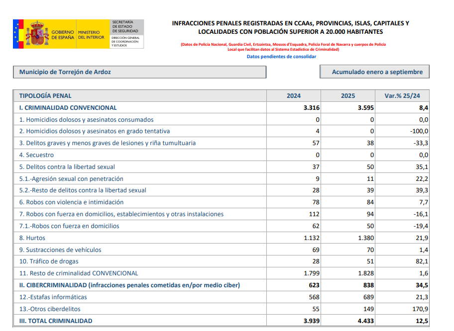 El último Balance de Criminalidad corresponde al tercer trimestre del año 2025, recoge la evolución de la criminalidad registrada en Torrejón de Ardoz en el acumulado de enero a septiembre de 2025.