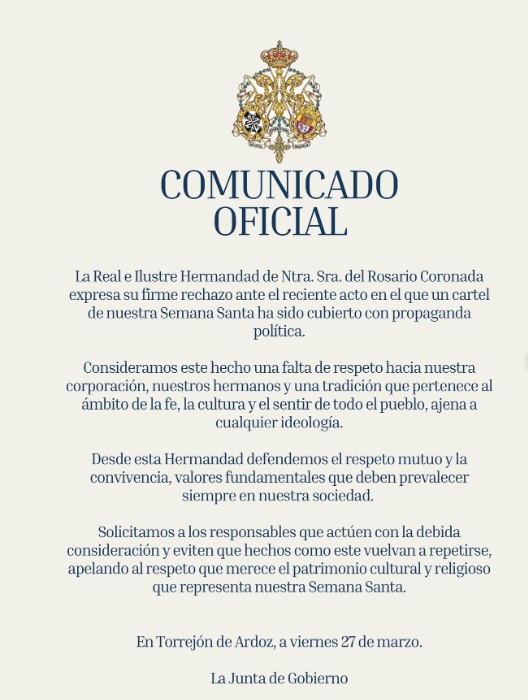 La Real e Ilustre Hermandad de Ntra. Sra. del Rosario Coronada ha manifestado públicamente su «firme rechazo» ante un incidente en el que un cartel anunciador de su programación de Semana Santa ha sido cubierto con «propaganda política».