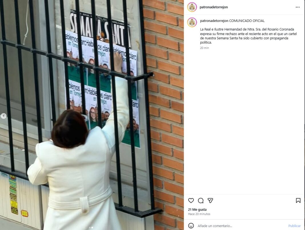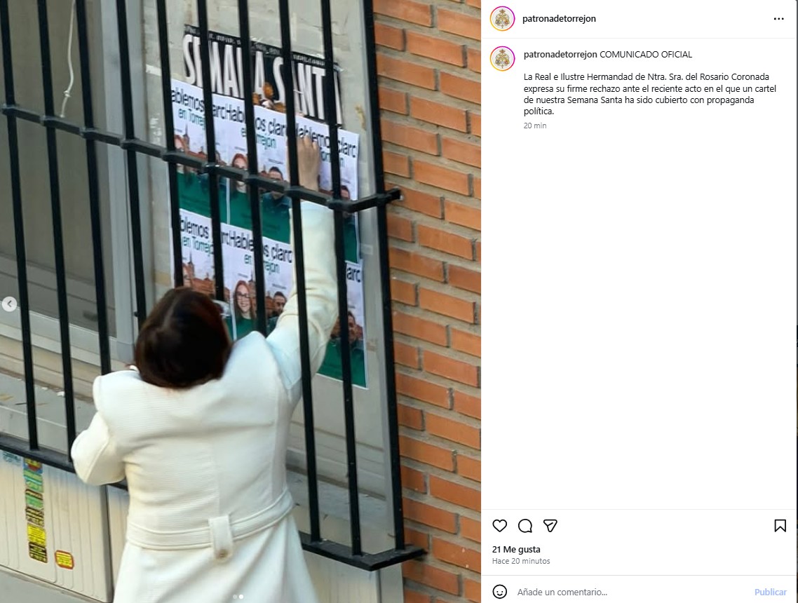 El comunicado hace referencia a una fotografía publicada por la propia entidad en la que aparece la portavoz de Más Madrid, Ruth Grass, colocando carteles de un acto político en un edificio municipal (la parte del Ayuntamiento que da a la calle Libertad).