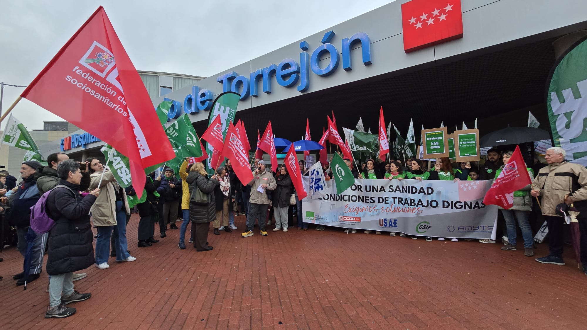Los profesionales sanitarios se concentraron el pasado lunes, 9 de febrero, frente al Hospital de Torrejón de Ardoz, convocados por los sindicatos CCOO, Satse, CSIF y SAE, para reclamar mejoras en la calidad asistencial, refuerzo de plantilla, mejores ratios paciente/profesional y salarios dignos.