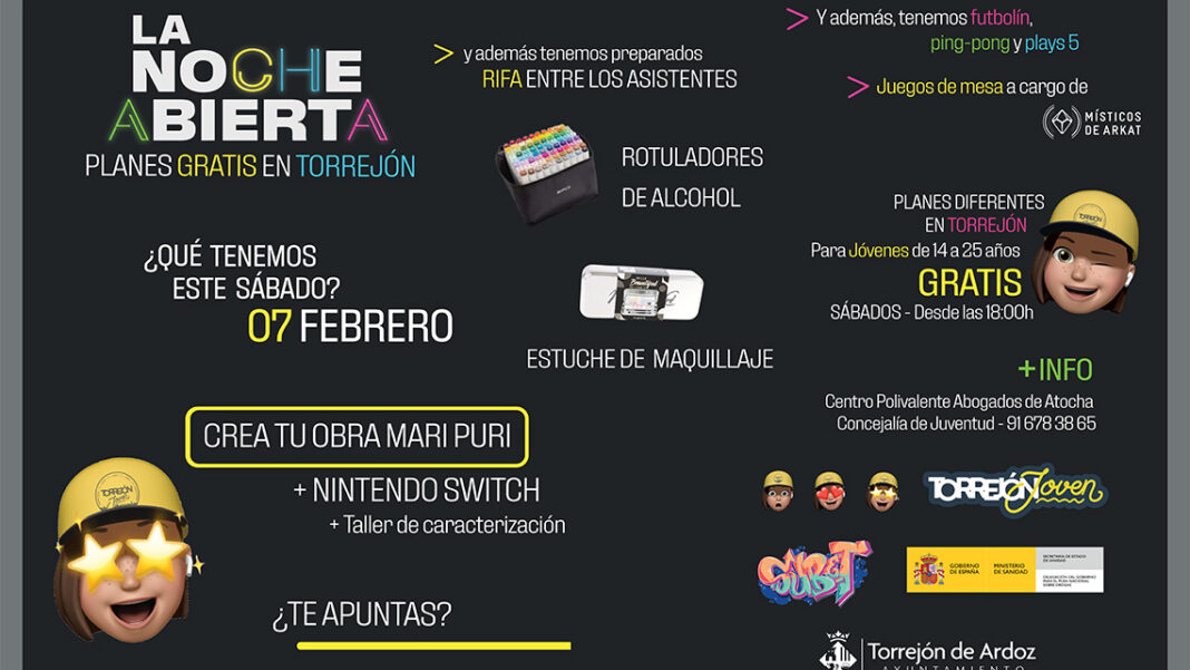 “La Noche Abierta” es un programa con planes diferentes y gratuitos de ocio nocturno saludable para jóvenes de 14 a 25 años que se adaptan a todos los gustos y que tiene lugar a partir de las 18:00 horas en el Centro Polivalente Abogados de Atocha, donde también se podrá disfrutar de futbolín, ping-pong, plays 5 y juegos de mesa a cargo de la Asociación Juvenil Místicos de Arkat.