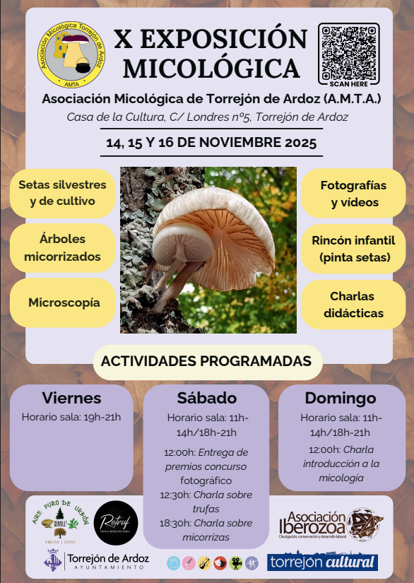 La Asociación Micológica de Torrejón de Ardoz (A.M.T.A.), en colaboración con el Ayuntamiento de la ciudad, invita a vecinos y visitantes a disfrutar de la X Exposición Micológica, que tendrá lugar los días 14, 15 y 16 de noviembre de 2025 en la Casa de la Cultura (calle Londres, nº 5).