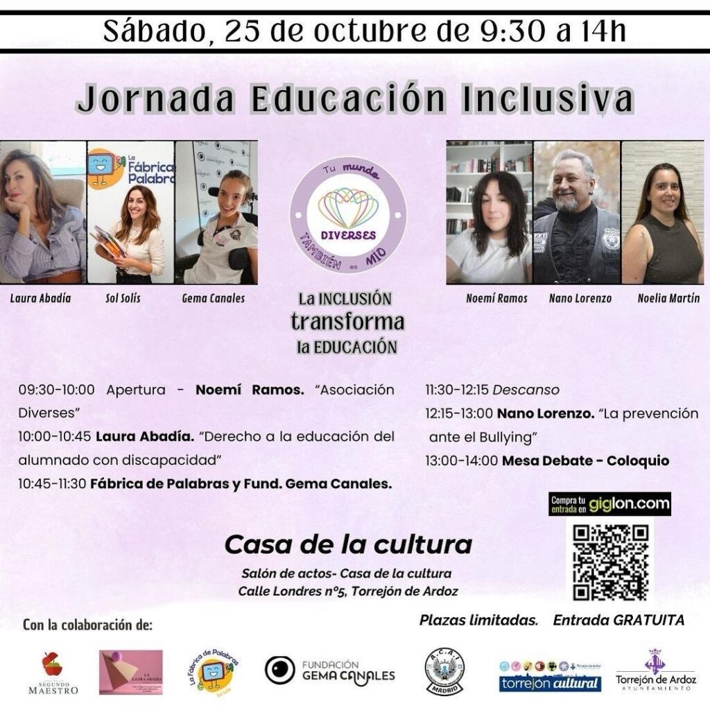 La Casa de la Cultura de Torrejón de Ardoz será el escenario el próximo sábado 25 de octubre, de 9:30 a 14:00 horas, de la Jornada Educación Inclusiva, un encuentro organizado por la Asociación Diverses con la colaboración de distintas entidades locales.