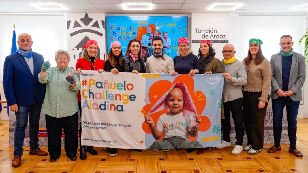 Que los niños enfermos de cáncer nunca pierdan la sonrisa. Ese es el objetivo principal de la campaña #PañueloChallenge de la Fundación Aladina, organizada con motivo del Día Mundial del Cáncer Infantil, que se celebrará este domingo, 15 de febrero, en todo el mundo. Como muestra de apoyo a los pequeños que sufren esta enfermedad y a sus familiares, Torrejón de Ardoz se ha sumado a esta iniciativa.