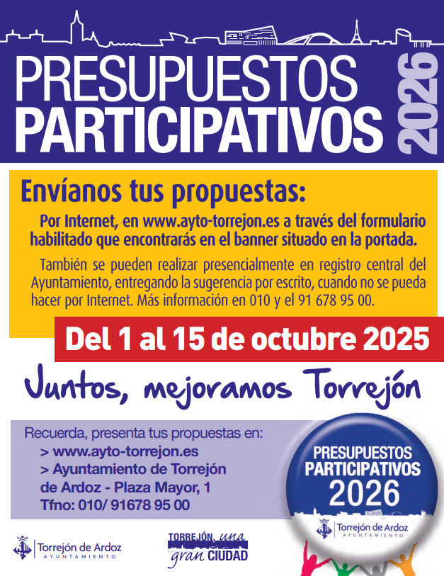 El Ayuntamiento de Torrejón de Ardoz ha abierto el periodo de participación ciudadana para que los vecinos puedan aportar sus propuestas de cara a la elaboración de los Presupuestos Municipales 2026. Los ciudadanos podrán realizar sus aportaciones hasta el próximo 15 de octubre.