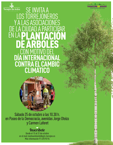 Con motivo del Día Internacional Contra el Cambio Climático, el alcalde de Torrejón de Ardoz, Alejandro Navarro Prieto, ha invitado a todos los ciudadanos y asociaciones locales a participar en una jornada de plantación de árboles que se celebrará el próximo sábado, 25 de octubre, a las 10:30 horas en el Paseo de la Democracia, avenidas Jorge Oteiza y Carmen Laforet.