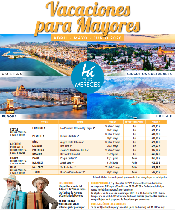 La adjudicación de plazas se realizará por sorteo y las listas de admitidos se publicarán en el CMM El Parque, CMM Las Veredillas y en la Concejalía de Mayores el 14 de abril, para los destinos de Europa y el 16 de abril, para el resto de las escapadas.